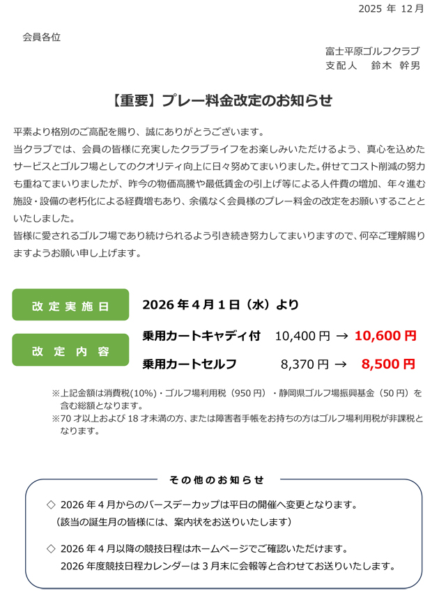 メンバープレーフィ改定のお知らせ